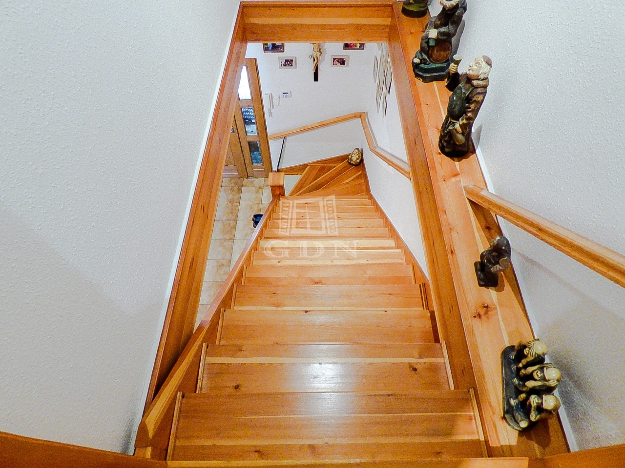A földszinti részre feljuthatunk a külső teraszról vagy a belső lépcsőházból, ezen lakrészen hatalmas, Déli fekvésű bárral felszerelt nappali (49 nm), étkezős konyha (15 nm), fürdőszoba, szülői hálószoba vagy dolgozó szoba lett kialakítva, minden helyiségben radiátoros fűtéssel.