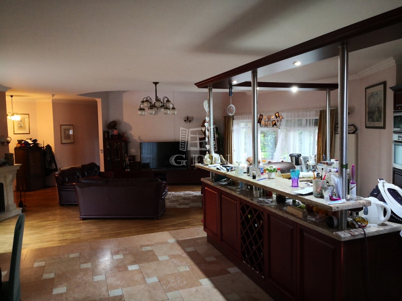A földszinten több mint 100 négyzetméteres nappali-konyha-étkező, gyönyörű kandallóval, egy hűtött spejz, 3 szoba, 2 fürdőszoba, és egy különálló wc található. A nappaliból jobbra, balra, két hatalmas teraszra léphetünk ki.