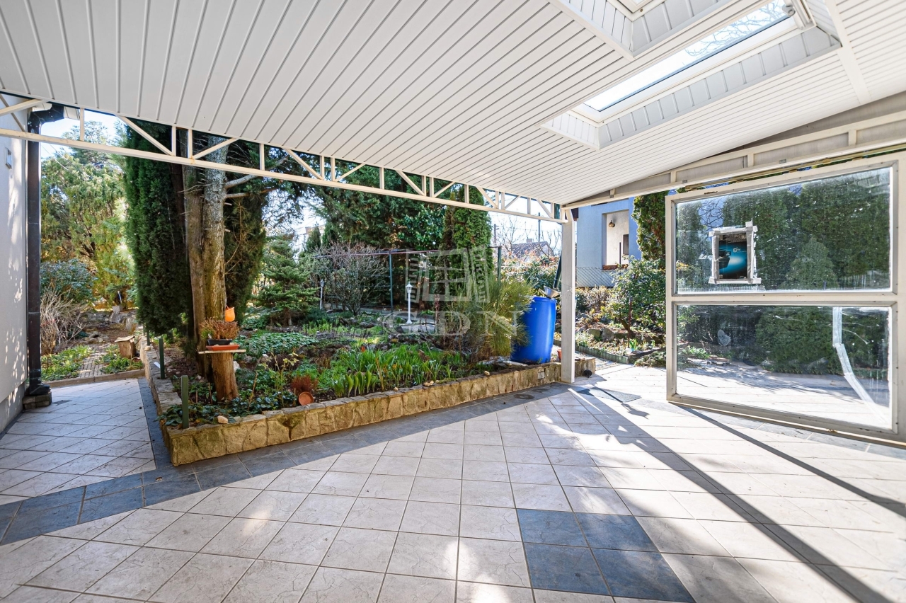 A bejárat előtt egy 17m2-es nyitott terasz, és egy 25m2-es fedett terasz kialakított ( tetején Velux ablakokkal), innen tudunk bemenni a ház földszintjére és a külön bejáratú garzon lakásba.