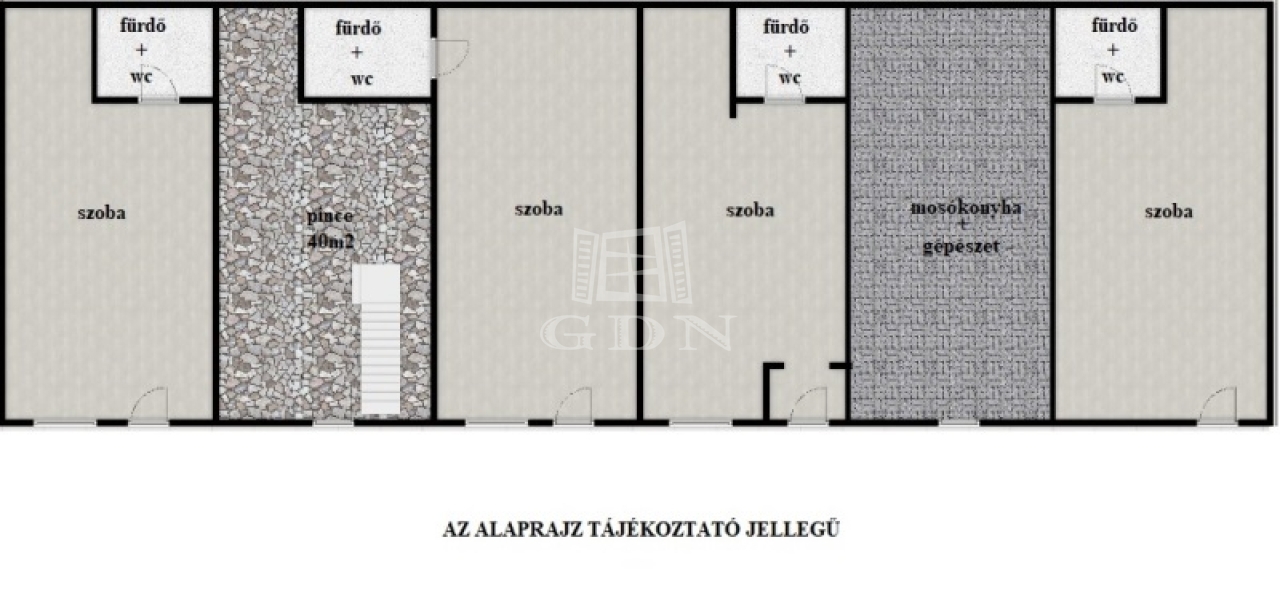 Az ingatlan két épületből áll, amelyben összesen 13 szoba, konyha+étkező, mosókonyha található. Az ingatlan további előnye, hogy 40m2 pincével is rendelkezik.