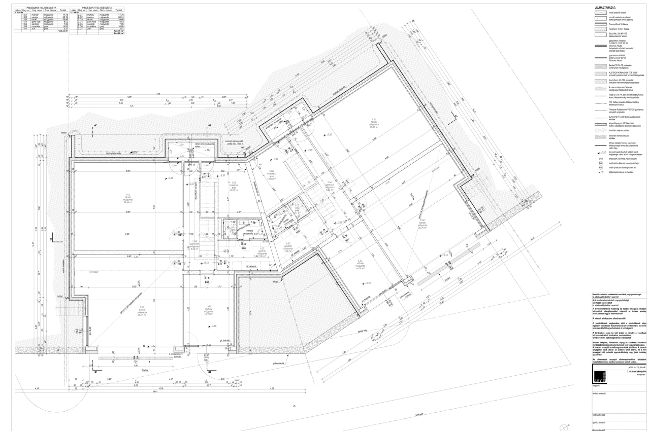 •15cm-es vasbeton falazat 20cm (kívül 15cm, belül 5cm) grafitos polisztirol szigeteléssel és Ytong válaszfalakkal