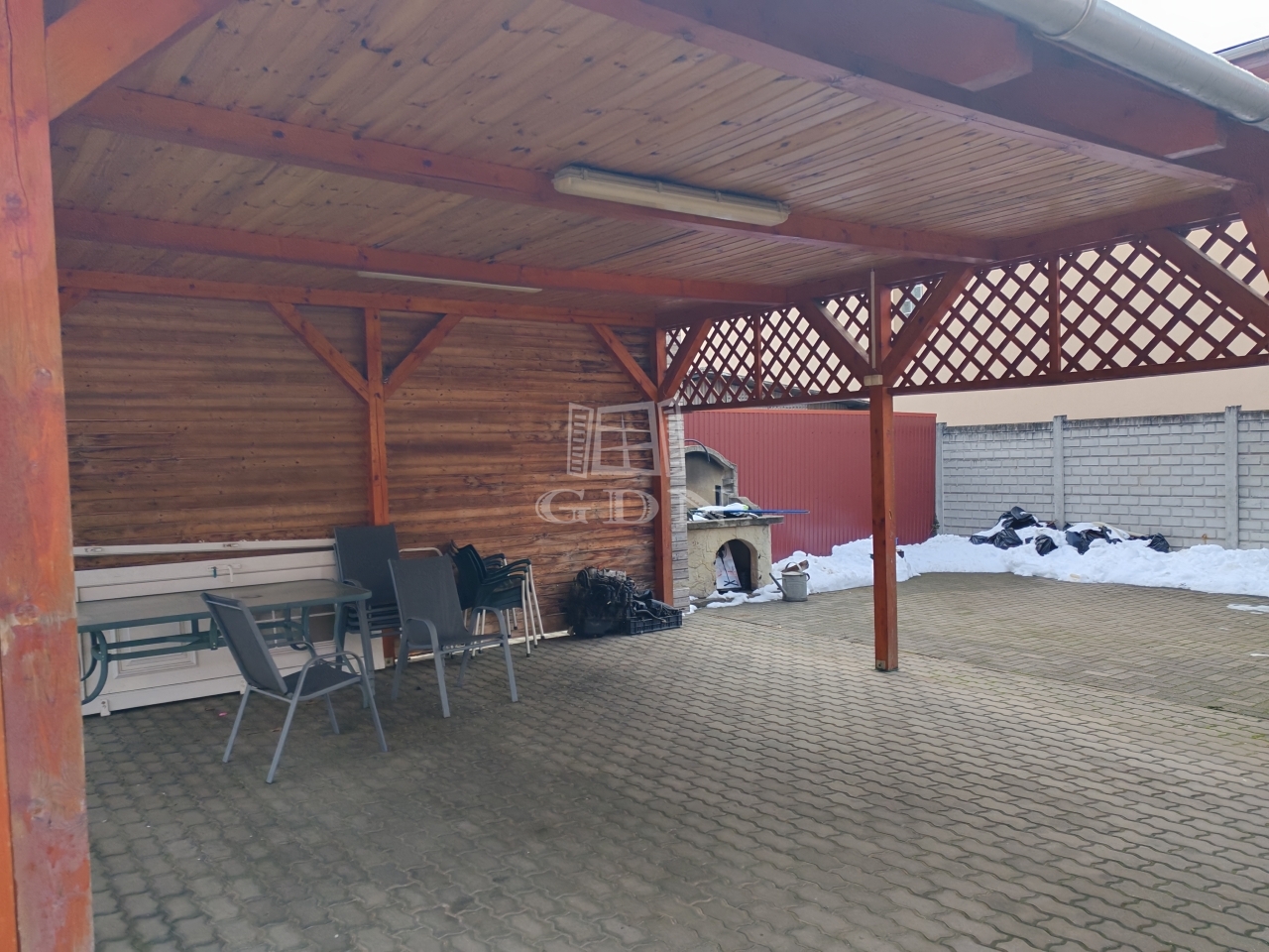 Garázs:25nm, szerelőaknás, pince lejárattal + 3 db tároló helyiség, kerti fedett kiülő ,fából, tetővel ellátva.