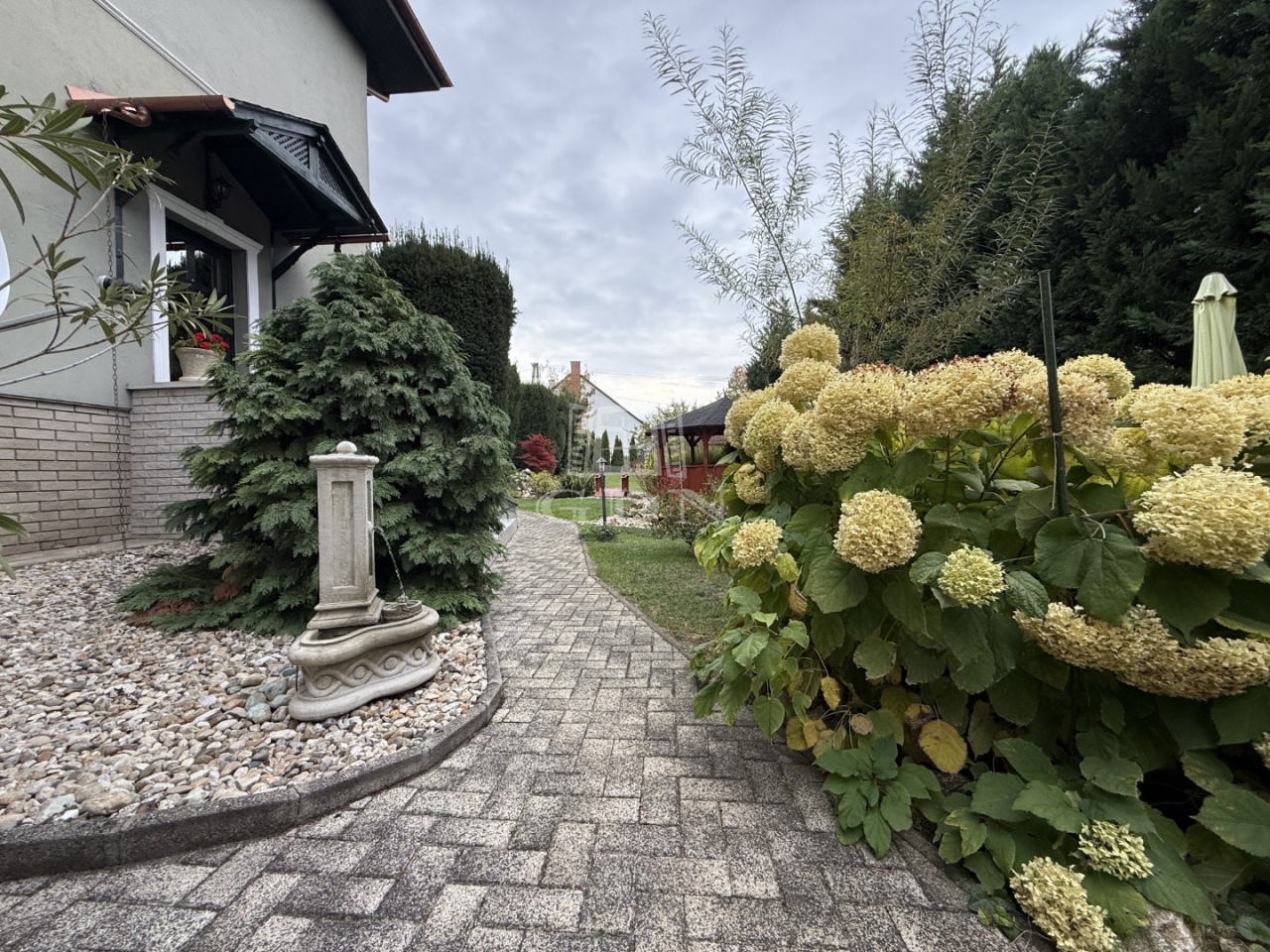 A gyönyörűen parkosított kertbe egy kovácsoltvas kapun keresztül jutunk, ahol a garázson kívül több gépjármű parkolása biztosított, térkövezett beállókkal. A kert öntözőrendszerrel ellátott. Az ingatlan riasztó és kamera rendszerrel felszerelt.