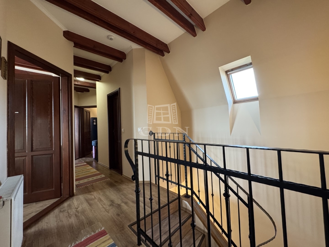 A kétrétegű üvegezésü, hőszigetelt nyílászárók, a magas minőségű hideg- és melegburkolatok, a dizájnos falpanelek, valamint a tetőtérben megjelenő látszógerendák természetes, elegáns megjelenést kölcsönöznek az otthonnak.