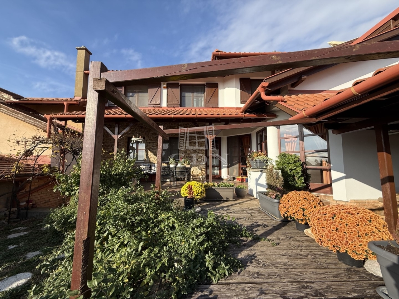 A 3047 m²-es, teljesen körbekerített telek gondosan karbantartott, rendezett. Az ingatlan egy 4 lakásos sorház középső lakása. A bejutás elektromos kapun keresztül, közös térkövezett behajtón történik.