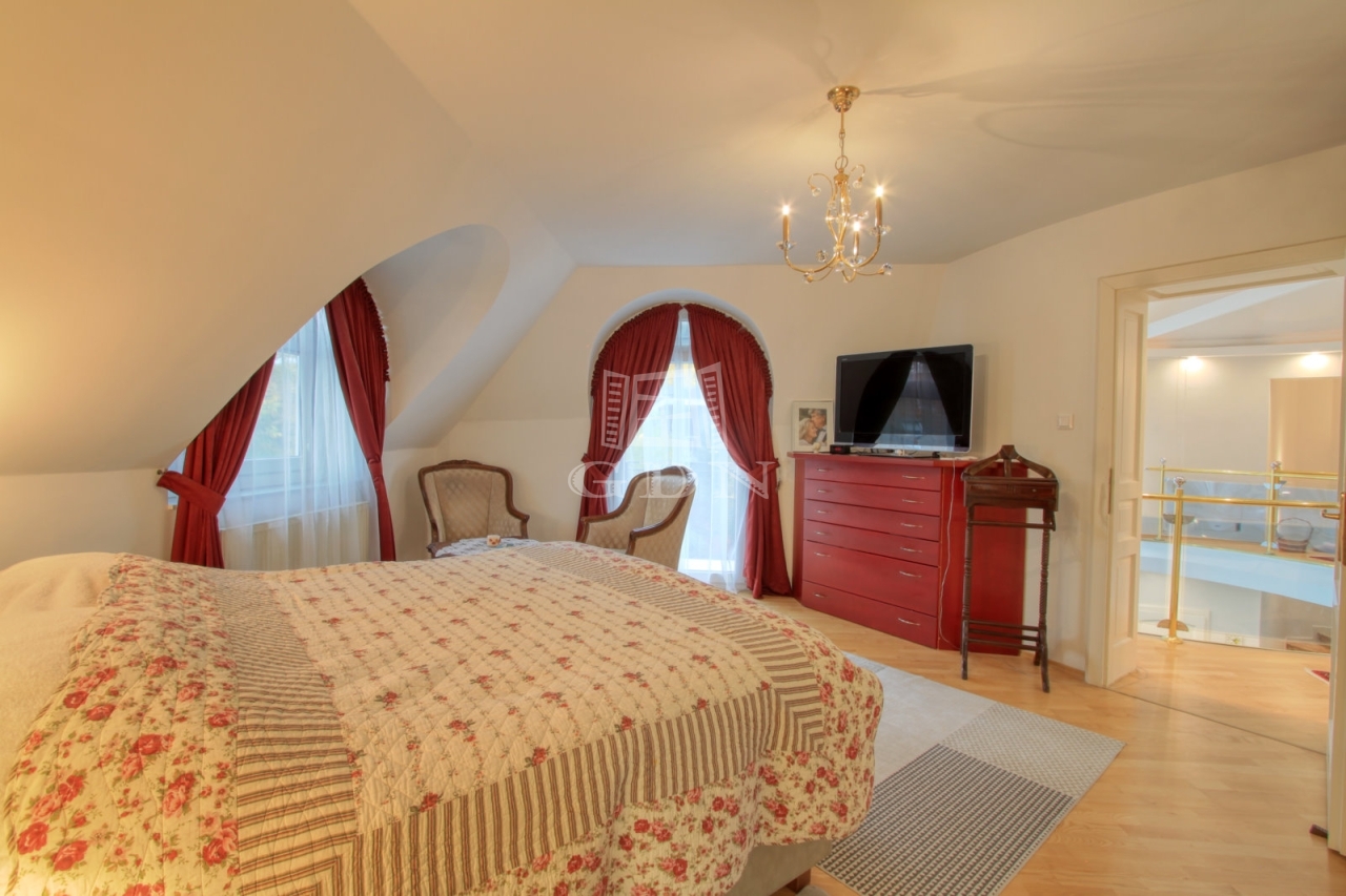 Az emeleti szinten a kör alakú galéria térből juthatunk egy 15 m2-es gardrób szobán keresztül 2 db hálószoba felé (ahol az egyik hálószobához erkély kapcsolat és zuhanyzós fürdőszoba tartozik), illetve a fő hálószoba és dolgozószoba irányába. A fő hálószobából tágas, walk-in zuhanyzóval, pezsgőfürdős káddal rendelkező fürdőszoba nyílik.